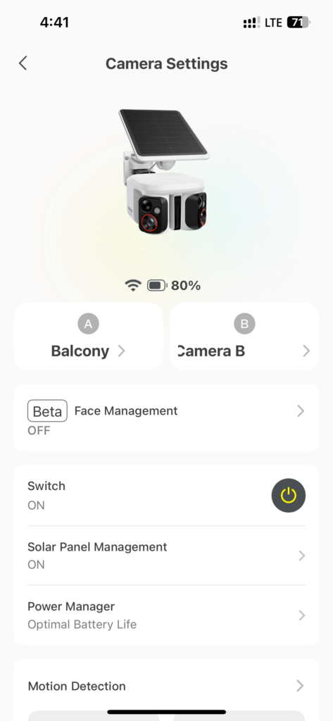 What really impressed me, though, is how the solar panel doesn’t just sit there. It’s mounted on a motorized pivot that tracks the sun throughout the day. It can adjust its angle up to 120 degrees. Baseus says 20 minutes of sun can power a full day of operation. I haven’t charged it once since I installed it, and the battery indicator still hasn’t budged. That’s the beauty of solar done right.